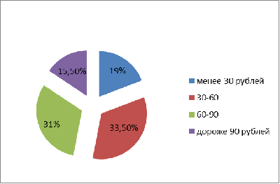 укладывается в диапазон цен 30-60 рублей (9 раз и примерно 33,5% случаев) и