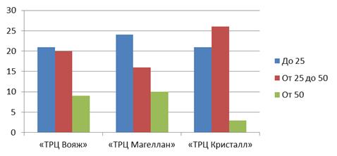 · что касается покупателей по возрастному признаку, то «ТРЦ Кристалл» посещают люди более молодого возраста, это связано с его месторасположением и существующих в нем магазинов.