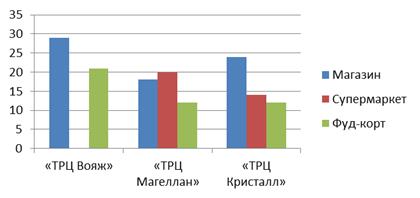 ТРЦ Вояж, следом за ним идет «ТРЦ Кристалл» и завершает «ТРЦ Магеллан». Разница