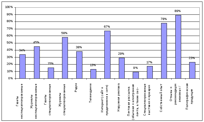Исходя из данных, представленных на рис. 2.18, можно говорить о том, что при поиске информации потребители на автомобильном рынке наибольшее внимание уделяют Интернет-продвижению, рекламе в СМИ, радио-рекламе и наружной рекламе, а также специализированным и неспециализированным журналам.