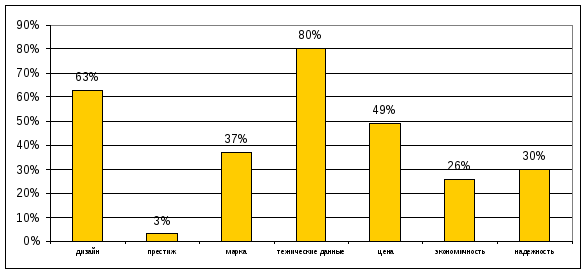 Выбор автомобиля зависит, в первую очередь, от технических данных товара (80%). Дизайн (63%) и цена (43%) тоже играют важную роль. А экономичность, долговечность и престижность находятся на втором плане (рис. 2.13).