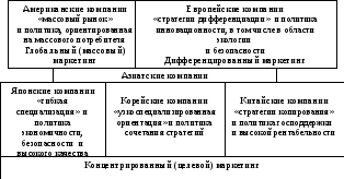 3. Азиатский подход предполагает узкую специализацию производства с элементами копирования на основе массового выпуска, использование приемов концентрированного маркетинга в разработке стандартизированного и индивидуализированного комплексов маркетинга.