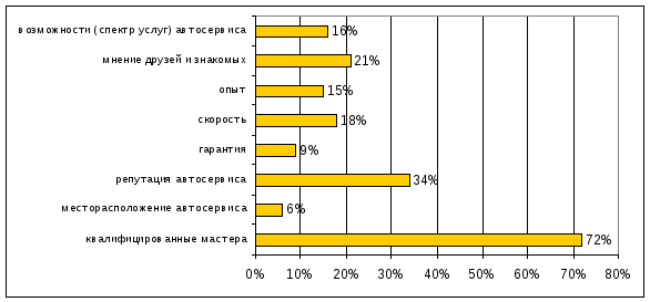 При выборе автосервиса респонденты руководствуются: наличием квалифицированных мастеров (72%), репутацией автосервиса (44%), своим собственным опытом (34%), возможностями автосервиса (31%) (рис. 2.15).