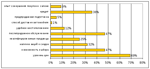Наиболее важными критериями при выборе автосалона являются: уровень цен (69%), возможность выбора (47%), послепродажное обслуживание (47%), а также наличие скидок (31%) (рис. 2.14).