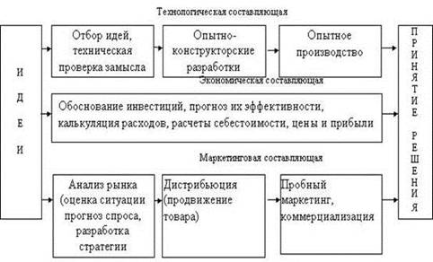Процесс от идеи до готового продукта включает в себя пять основных этапов: выработка идеи; концептуальная проработка; опытно-конструкторская разработка, включая создание опытного образца; пробный выход на рынок; коммерциализация. На первом этапе производится первичная оценка предложений по разработке новых товаров и услуг с целью выбрать из них более эффективные.