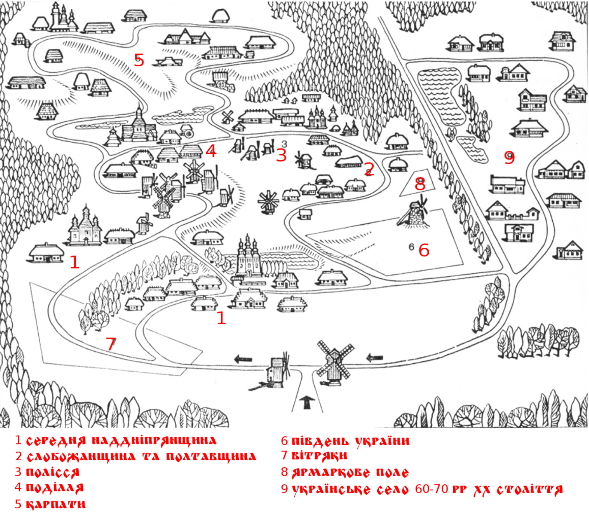 У музеї представлені головні етнографічні зони України (їх шість): Полісся, Наддніпрянщина, Слобожанщина, Карпати, Поділля і Таврія. Пирогово - це величезна жива казка, де змішалися українські хати, широкі поля, тінисті стежки, млини, язичницькі кам'яні ідоли і чорні від часу православні церкви. Чудовий куточок для відпочинку на мальовничій околиці Києва.