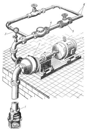 1 – всмоктувальна труба з клапаном; 2 – відцентровий насос; 3 – манометр; 4 – напірна труба із зворотним клапаном; 5 – вентиль; 6 – обвідна лінія; 7 – електродвигун.