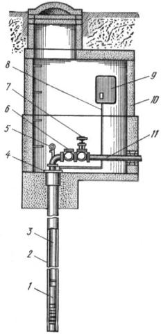 1 – насос; 2 – свердловина (обсадна труба); 3 – водопідйомний трубопровід; 4 – опорна плита; 5 – манометр; 6 – зворотній клапан; 7 – засувка; 8 – кабель; 9 – станція керування; 10 – підземне приміщення; 11 – нагнітальна труба.