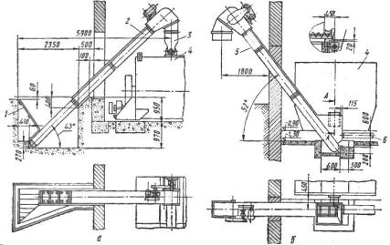 Завод-виробник постачає транспортери у розібраному вигляді. Складання починають із встановлення кінцевої секції, яку кріплять до фундаменту приямка (рис. 13). Потім послідовно з'єднують останні секції. Зазори й виступи в місцях з’єднання секцій не допускаються. Транспортерні полотна ставлять у короби транспортерів зверху вниз за допомогою сталевого канату діаметром 6…8 мм. Складаючи транспортерне полотно, слід перевіряти правильність розміщення скребків залежно від напрямку руху транспортерів. Якщо кут похилу транспортерів становить понад 300, продукт потрапляє під скребки, нагромаджується під ними, піднімає скребки, погано переміщується вверх і пересипається через борти короба транспортера. Тому не рекомендується встановлювати скребкові транспортери під кутом понад 250.