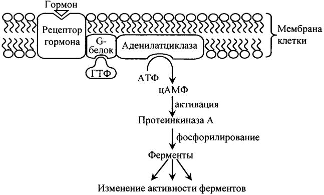 Пока гормон не действует на клетку, аденилатциклазная система неактивна; все её компоненты разобщены и с G-белком связан ГДФ. Однако после связывания гормона с рецептором происходит последовательное изменение конформации всех компонентов аденилатциклазной системы, G-белок обменивает ГДФ на ГТФ, переходит в активное состояние и активирует аденилатциклазу, которая из АТФ синтезирует цАМФ. Циклический АМФ, в свою очередь, активирует специфическую цАМФ–зависимую протеинкиназу (протеинкиназу А), которая фосфорилирует внутриклеточные ферменты, в результате чего изменяется активность ферментов.