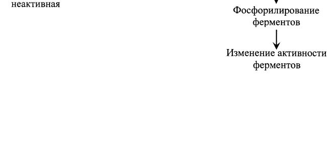 Протеинкиназа состоит из 4 субъединиц (тетрамер), две из которых являются регуляторными, а две – каталитическими (рис. 3). В таком виде протеинкиназа неактивна. При связывании протеинкиназой 4 молекул цАМФ происходит отсоединение (диссоциация) каталитических субъединиц, которые фосфорилируют белки (ферменты), изменяя их активность.