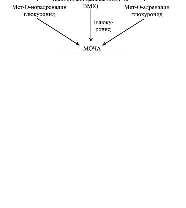 Распад адреналина и норадреналина происходит в печени (рис. 9). При этом образуются метоксинорадреналин глюкуронид и метоксиадреналин глюкуронид, составляющие 30 % от всех продуктов распада адреналина и норадреналина, а остальное количество приходится на ванилилминдальную кислоту (ВМК),