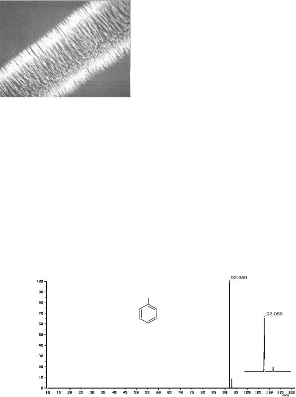 имеют сходную картину распада молекулярного иона. Например, в спектрах моноалкилбензолов присутствует осколочный ион с m/z = 91, соответствующий образованию катиона тропилия в результате бензильного разрыва, что может быть использовано при установлении структуры. Масс-спектр органического соединения, записанный в условиях электронной ионизации, обладает высокой индивидуальностью. Получается своего рода отпечаток пальца молекулы, с помощью которого проводят идентификацию. Для этого масс-спектр анализируемого образца сравнивают с масс-спектрами известных соединений, сопоставляя величины m/z и интенсивности всех сигналов. В настоящее время эту работу выполняет компьютер масс-спектрометра, сразу выдавая совпавшие структуры.