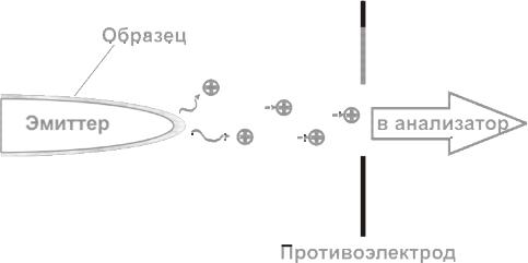 Различие между ионизацией электрическим полем и полевой десорбцией заключается в агрегатном состоянии анализируемых объектов. Ионизация электрическим полем (FI) применяется для получения масс-спектров газообразных соединений, эмиттер находится в заполненной газом-веществом камере. При ионизации десорбцией электрическим полем (FD) вещество непосредственно наносится на эмиттер, что позволяет анализировать жидкости и твердые вещества. На рисунке 9 приведена схема такой установки.