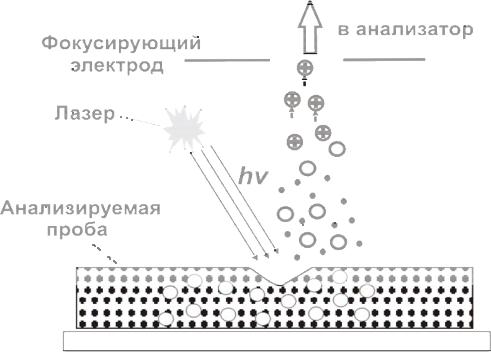 Метод заключается в облучении короткими лазерными импульсами образца, представляющего собой твердый раствор анализируемого соединения в органической матрице (рисунок 12).