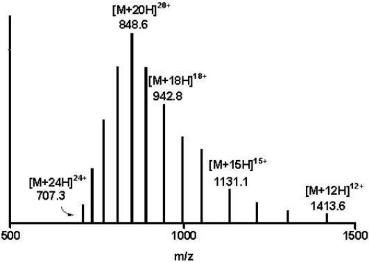 Рисунок 17 – ESI-спектр миоглобина (Mr = 16951.5 Да), растворитель – смесь ацетонитрил–вода, 1:1