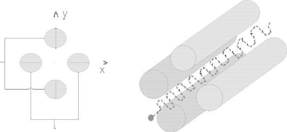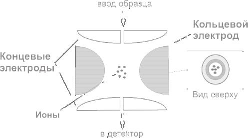 Два концевых электрода гиперболической формы имеют потенциал земли, между ними находится кольцевой электрод, на который подается радиочастотное напря-
