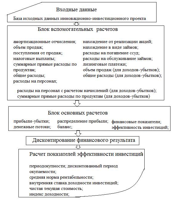 Для выбора и обоснования рациональных управленческих решений, оценки экономической эффективности проекта на прединвестиционной фазе разработана математическая модель, которая позволяет получить адекватный конечный результат. Блок-схема математической модели оценки экономической эффективности инвестиционно-инновационных проектов в производстве приведена на рисунке [1, 2].