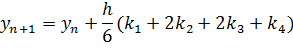 ym+1=ym+h/6(R1+2R2+2R3+R4) (1.13)1=f(xm,ym) (1.14) 2=f(xm+h/2,ym+hR1/2) (1.15)3=f(xm+h/2,ym+hR2/2) (1.16)