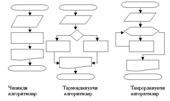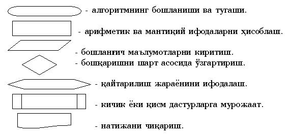 Юқоридаги схемалар блоки элементларидан фойдаланиб, алгоритм турларининг намунавий кўринишларини қуйидагича ифодалаш мумкин: