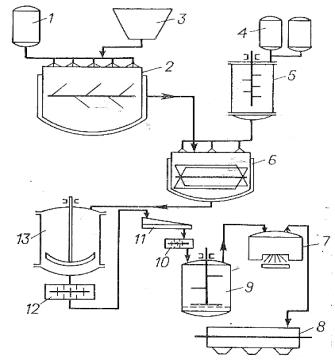 смеситель; 6 - ацетилятор; 7 - центрифуга; 8 - вакуум-сушилка; 9 - промывной