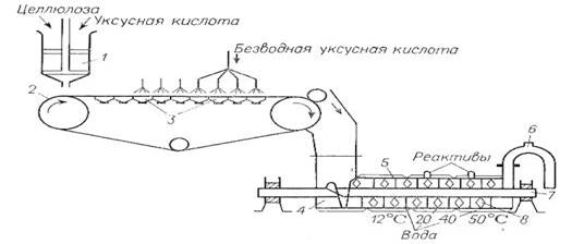 Целлюлозу подвергают обработке уксусной кислотой. После загрузки целлюлозы в ацетилятор, в него в два (или более) приема вводят ацетилирующую смесь. Необходимой степени гидролиза достигают регулированием времени воздействия ацетилирующей смеси на ацетат целлюлозы. Реакцию гидролиза прекращают введением в реакционную среду 30%-ного раствора ацетата натрия. Содержимое осадителя непрерывно перемешивается. Осажденный ацетат с конца ленты траспортера попадает в резервуар, а жидкость, проходя через отверстия в ленте, снова возвращается в осадитель, циркулируя по замкнутому циклу. Из нижней части резервуара ацетат целлюлозы подают на промывку. Промывная машина может быть использована и для частичного омыления триацетата целлюлозы, что позволяет получить продукт, использующийся при изготовлении основы. Малое количество серной кислоты, вводимой в качестве катализатора, позволяет избежать стадии стабилизации. Далее ацетат целлюлозы попадает в вакуумную сушилку, где перемешивается обогреваемыми изнутри лопастями [3].
