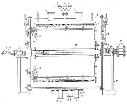- трубка для термометра; 2 - патрубок для выхода паров бензола; 3, 4, 18 - штуцер заглушения; 5 - патрубок для подачи холодной воды; 6 - обечайка; 7 - корзина; 8 - смотровой люк; 9 - сальник; 10 - звездочки; 11 - вал; 12 - стойки; 13 - патрубок для подачи промывной воды; 14 - патрубок для выхода отработанной ацетилирующей смеси; 15 - патрубок для слива воды; 16 - загрузочный люк; 17 - патрубок для подачи ацетилирующей смеси; 19 - разгрузочный люк.