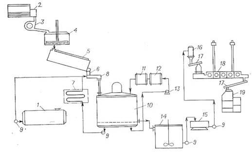 - емкость для ацетилирующей смеси; 2 - рыхлительная машина; 3 - молотковая дробилка; 4 - кондиционер; 5 - активатор; 6 - поворотное устройство; 7 - холодильник; 8 - загрузочный шнек; 9 - насосы; 10 - ацетилятор; 11, 12 - теплообменники; 13 - циркуляционный насос; 14 - смеситель; 15 - пульсирующая центрифуга; 16 - циклон; 17 - транспортирующие шнеки; 18 - коридорная сушилка; 19 - пресс.