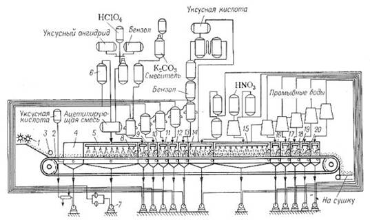 Ацетилирующая смесь состоит примерно из 60% уксусного ангидрида, 20% уксусной кислоты и 20% бензола. Вслед за ацетилирующей смесью в ацетилятор подают катализатор - хлорную кислоту в количестве 0,7-0,8% от массы сухой целлюлозы. В процессе ацетилирования в аппарат вводят дополнительное количество бензола, предотвращающего растворение образующегося эфира целлюлозы. По окончании ацетилирования в ацетилятор подают 10%-ный раствор ацетата натрия или калия, связывающего хлорную кислоту и прекращающего реакцию этерификации. Образовавшийся триацетат целлюлозы отжимают при максимальной частоте вращения барабана ацетилятора, а отработанную ацетилирующую смесь направляют на регенерацию. Затем триацетат промывают бензолом. Обычно делают четыре бензольные промывки, после чего в аппарат подают острый пар, которым отгоняют бензол, и промывают триацетат целлюлозы водой.