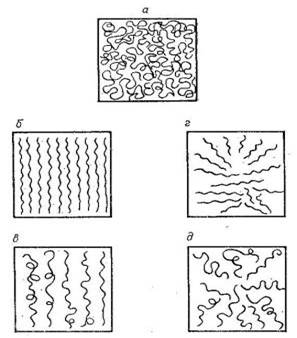 а - плотная упаковка макромолекул; б - рыхлая упаковка; в - плоскоориентированные макромолекулы.