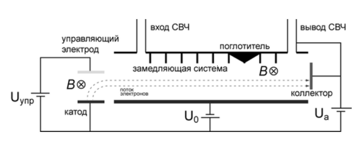Лампа имеет две основные части: инжектирующее устройство и пространство взаимодействия (рис. 1). Инжектирующее устройство, состоящее из подогреваемого катода и управляющего электрода, обеспечивает создание ленточного электронного потока и ввод его в пространство взаимодействия. Пространство взаимодействия, состоящее из волноводного входа СВЧ, поглотителя, замедляющей системы (анода), волноводного выхода СВЧ, коллектора и холодного катода (пластина с выводом U0), обеспечивает взаимодействие электронов с СВЧ-полем.