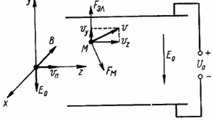 Если имеется только продольная составляющая поля Ez, то направление переносной скорости определяется векторным произведением [Ez,B], когда Ez – тормозящее поле, переносное движение идёт вверх, при ускоряющем поле – вниз, как показано на рисунке 4. Таким образом, продольная составляющая поля Ez определяет вертикальное движение электронов: в тормозящем поле смещаются вверх к положительному электроду, п в ускоряющем – вниз, к отрицательному электроду.