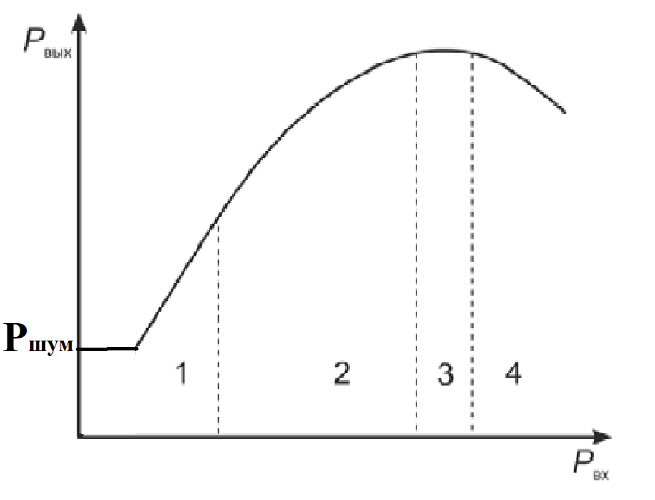 На рис. 3 показана типичная амплитудная характеристика (АХ) ЛБВ. Такая форма АХ обусловлена особенностями группирования электронного потока в ЛБВ. В линейной области 1 (коэффициент усиления ЛБВ не зависит от амплитуды входного сигнала) входной сигнал слишком слаб, чтобы сформировать максимально плотные сгустки даже вблизи выхода ЗС. Поэтому плотность сгустков (и отдаваемая ими энергия) пропорциональна амплитуде входного сигнала. Увеличение входной мощности (область 2) приводит к тому, что максимальная плотность сгустков достигается в пределах ЗС. При этом сгустки отдают энергию полю, амплитуда которого увеличивается и достигает максимума вблизи выхода ЗС. В этой области электронные сгустки отдают энергию полю, так как они движутся быстрее медленной волны. По мере уменьшения энергии сгустков их скорость уменьшается. Торможение сгустков усиливается с увеличением входной мощности, поэтому они начинают отдавать меньшую часть своей энергии, и рост выходной мощности замедляется.