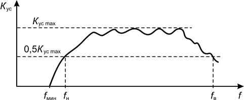 Полоса частот (fн-fв) – диапазон частот, в пределах которого выходная мощность (коэффициент усиления) уменьшается не более чем на заданное значение по сравнению с максимальной мощностью (коэффициентом усиления).