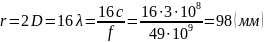 Радиус резонатора r составляет несколько длин волн. Из ранее написанного, пусть диаметра резонатора D равен 8 длинам волн, тогда: