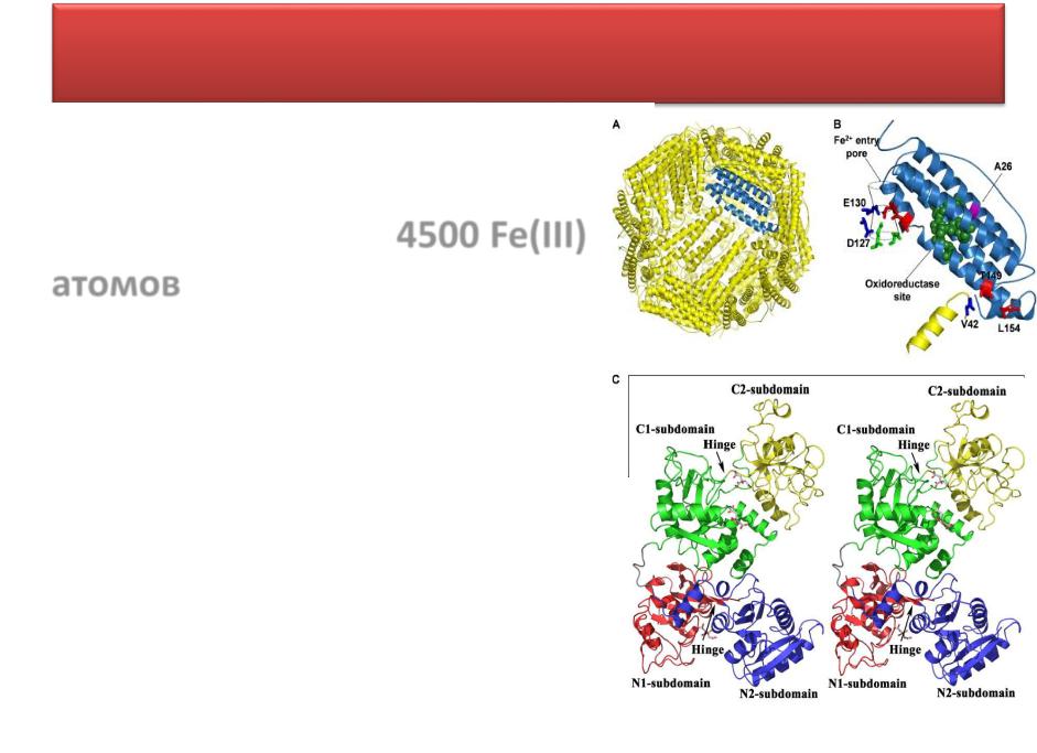 Ферритин содержит 24 субъединицы и способен аккумулировать до 4500 Fe(III)
