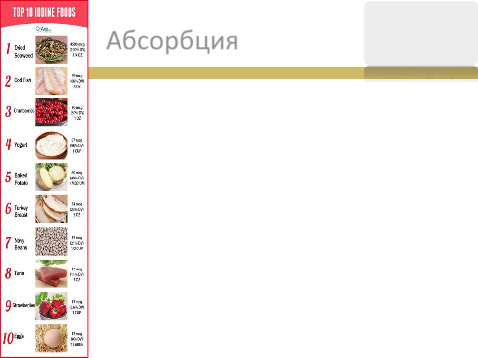 •Абсорбция йода приближается к 100%, особенно, когда он поступает в неорганической форме.