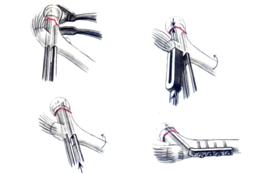 Затем вскрывают капсулу сустава параллельно оси шейки и при помощи трех ретракторов обнажают перелом. Острие первого ретрактора шириной 16 мм с длинным зубом проводят над передним краем вертлужной впадины. Второй крючок Хомана должен иметь короткий зуб. Его забивают краниальнее приблизительно в середину шейки. Здесь он не может нарушить кровоснабжения головки. Третий ретрактор проводят под шейкой. Стабилизация головки всегда сложна. Иногда удается ее удержать на месте путем забивания в ее нижнюю половину острия 8-мм ретрактора.