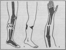 Мал. 266. Переломи кісток: а — відкритий (гомілки); б — закритий (передпліччя)