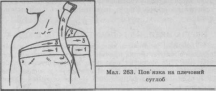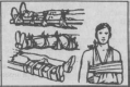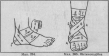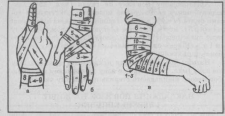Мал. 262. Пов'язки: а— спіральна на палець; б — хрестоподібна на кисть; в — спіральна на ліктьовий суглоб