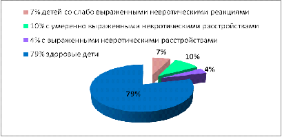 Анкетирования родителей, для контроля за возникновением пограничных нервно-психических расстройств - невротических реакций (беспричинные боли в животе, энурез, нарушение сна, тики, сосание пальца, обгрызание ногтей, страхи и т.п.) выявило 7% детей со слабо выраженными невротическими реакциями, 10% с умеренно выраженными невротическими расстройствами, которые наблюдались в течение второй - третьей четверти.
