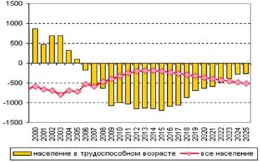 Как отмечают российские эксперты, при сохранении нынешних демографических тенденций в 2025 г трудоспособное население России сократится на 12,3% или на 18 млн. человек. Проанализировав диаграмму (Рис 1.) становится очевидно, что без привлечения иностранной рабочей силы нельзя будет поддерживать экономическое развитие России, не говоря уже о её модернизации .