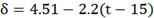 δ-((366,76*10-3)2*1101,4*106/δ2)= 674.6-2.22 *(-5-15)