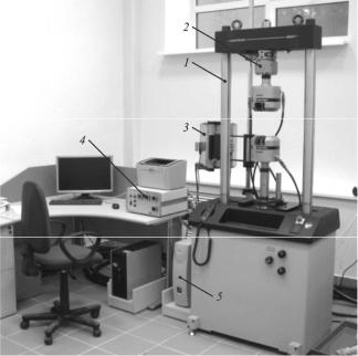 Рис. 2.21. Сервогидравлическая испытательная система Instron 8801: 1 – двухколонная высокопрецизионная рама со встроенными гидравлическими подъёмниками верхней траверсы; 2 – электронный датчик нагрузки Dynacell; 3 – трехзонная высокотемпературная печь SF 1770; 4 – трехзонный контроллер печи SFL; 5 – контроллер сбора и обработки экспериментальных данных FastTrack 8800