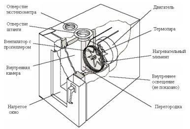 Схема циркуляции воздуха, создаваемой центробежным вентилятором в полости внутренней камеры и пропеллером вблизи двигателя, показана на рис. 2.31. Воздух направляется по траектории, напоминающей восьмерку – от нагревателей, находящихся позади перегородки, вдоль штанг подвижной нагрузки испытательной машины, вокруг образца и назад к внутреннему пропеллеру через контрольную термопару. Такой воздушный