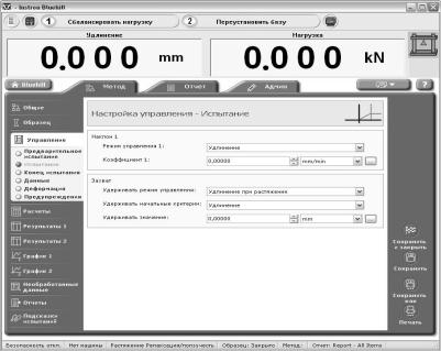 На рис. 4.4 представлено основное диалоговое окно программы Bluehill 2, которое содержит следующие ключевые вкладки: «Испытание», «Метод» и «Отчет».