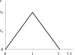 треугольника (как показано на рис. 5.19), что обеспечивает постоянную скорость деформации на этапах нагрузки и разгрузки. Зависимость деформации от времени должна сохраняться в течение всей программы испытаний. Частота циклирования поддерживается постоянной для каждого испытания изадаетсяравной0,5 Гц.