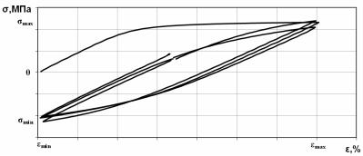 5)графики зависимостей напряжения от полной деформации, зафиксированные в начале, середине и конце (перед разрушением) испытания (пример типичных петель гистерезиса приведён на рис. 5.21);