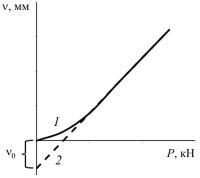 В целом зависимость «нагрузка – перемещение» носит нелинейный характер. Нелинейность наиболее выражена в нижней части зависимости, поэтому для вычисления податливости используют прямую линию, наложенную на верхнюю часть зависимости, как показано на рис. 5.28.