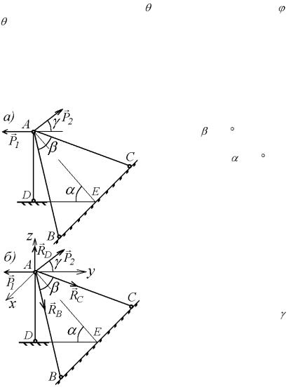 Пример 8.9. Два равных по длине столба AB и ВС образуют угол = 90 и лежат в плоскости, наклоненной к горизонту под углом = 60 , а в точке А поддерживаются вертикальным столбом AD. Весами силами тяжести столбов можно пренебречь и считать соединения в точках А, В, С и D шарнирными. Нижние концы столбов В, С и D расположены в горизонтальной плоскости. В общей вершине А приложены две силы - горизонтальная P1 = 16 кН и сила P2 = 4 кН, наклоненная к горизонту под углом = 30° (рис. 8.18, а). Обе эти силы лежат в вертикальной плоскости, делящей угол